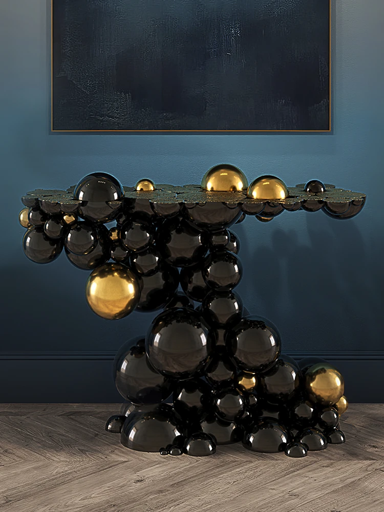 Italian Minimalist Luxury Bubble Console Table – Sleek Stainless Steel Entryway Table with Black Metal Decorative Strips for a Chic Entrance Display